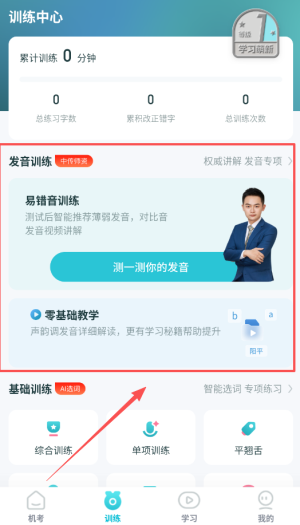 2.通过智能跟随单音节、多音节、短朗读,发音练习四种题型反复理解。