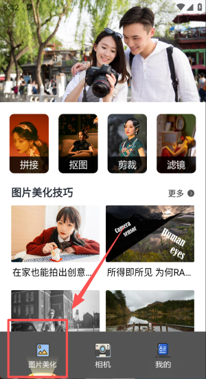 2、进入首页点“图片美化”,选拼接抠图滤镜快速完成创意修图。