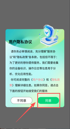 1、阅读协议后点击“同意”,授权设备标识收集以优化应用性能。