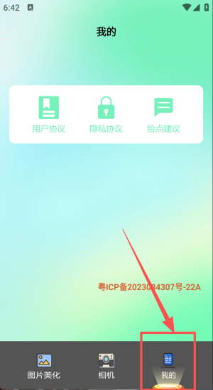 4、打开“我的”查看用户协议,随时给建议并确认备案号安全无忧。