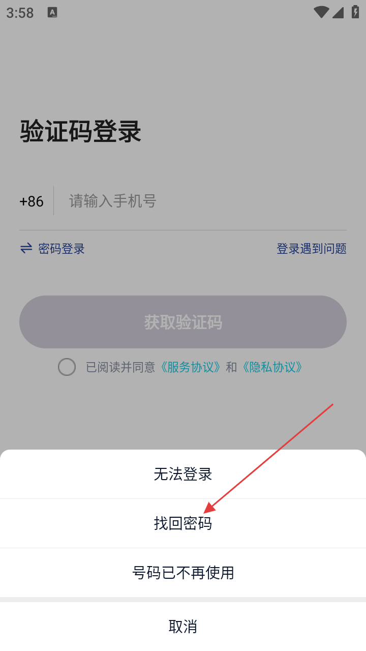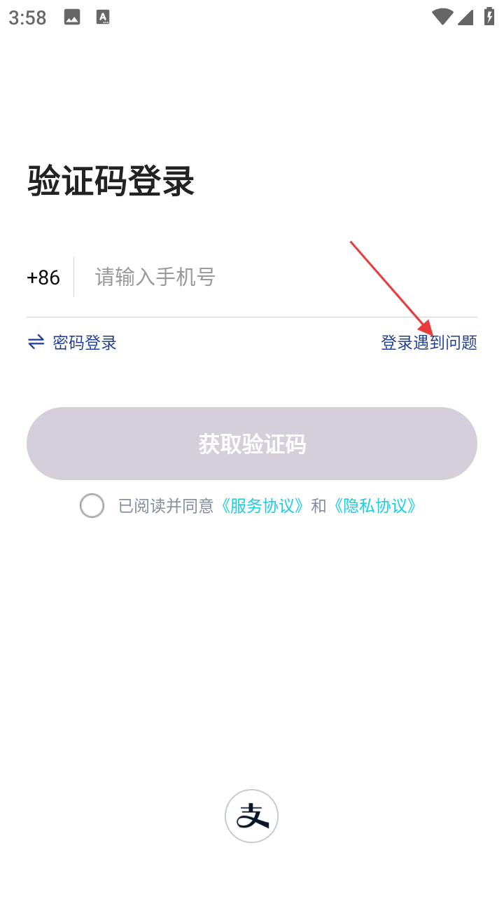 1、在验证码登录页面,若登录遇到问题,点击【登录遇到问题】,弹出问题选项框。