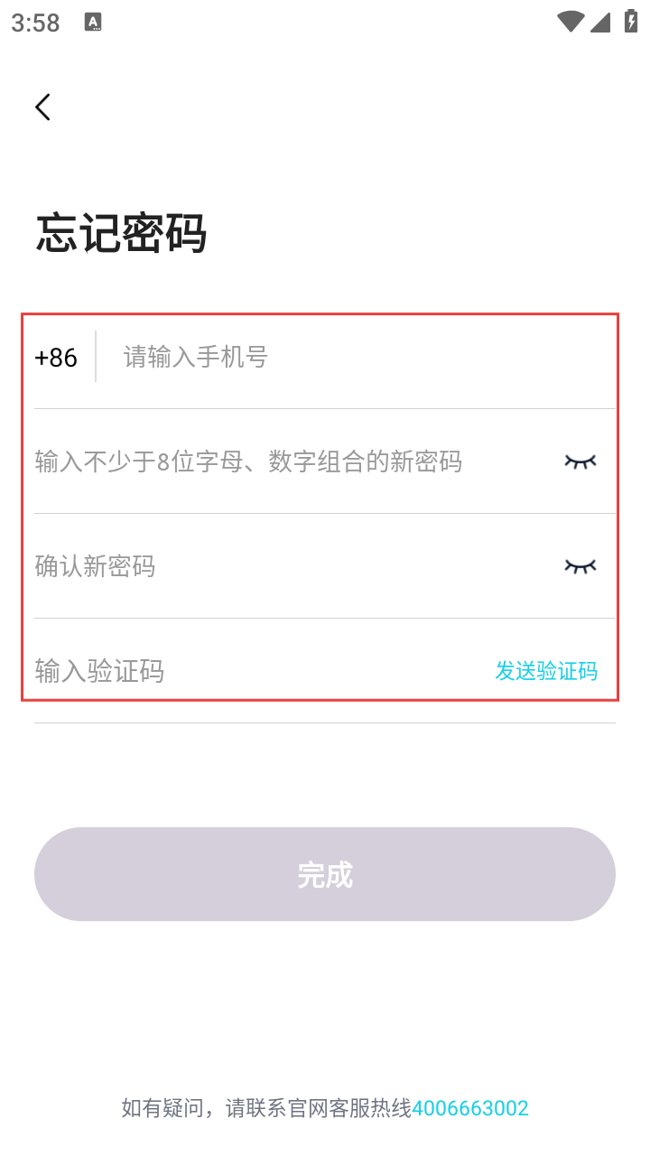 3、在忘记密码页面,依次填写手机号、新密码、确认新密码及验证码,准备完成密码重置。