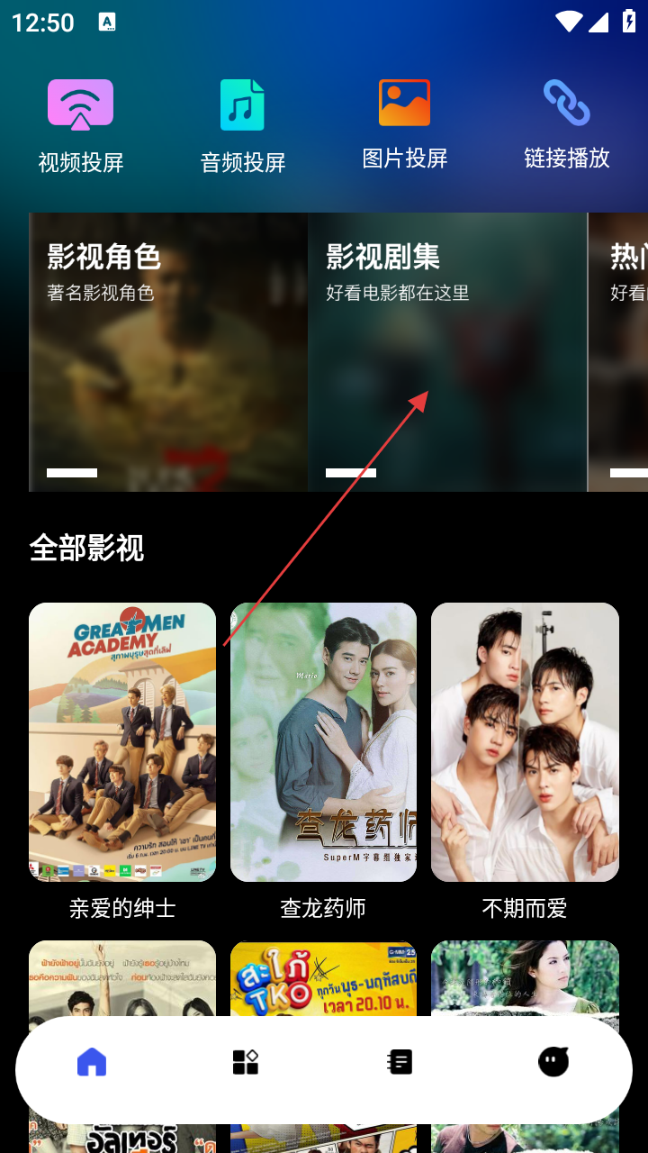 2、进入软件主界面,可利用【视频投屏】【音频投屏】【图片投屏】【链接播放】功能,点击【影视剧集】可查看好看电影相关内容。
