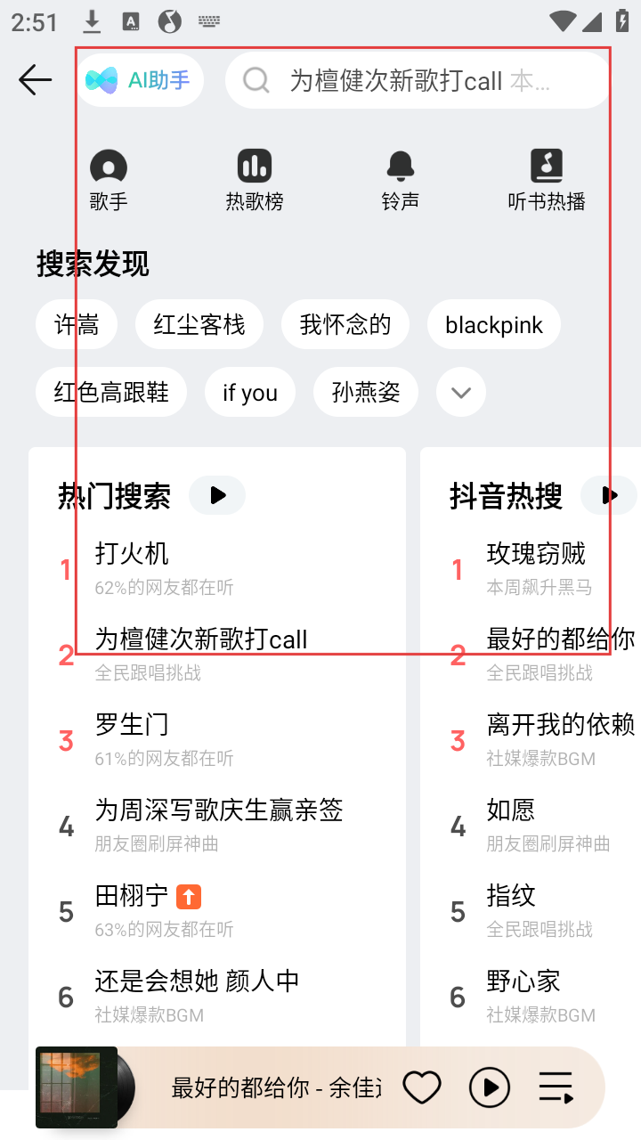2、进入搜索页面,能看到搜索发现、热门搜索等板块,在搜索框输入要找的歌曲名称。