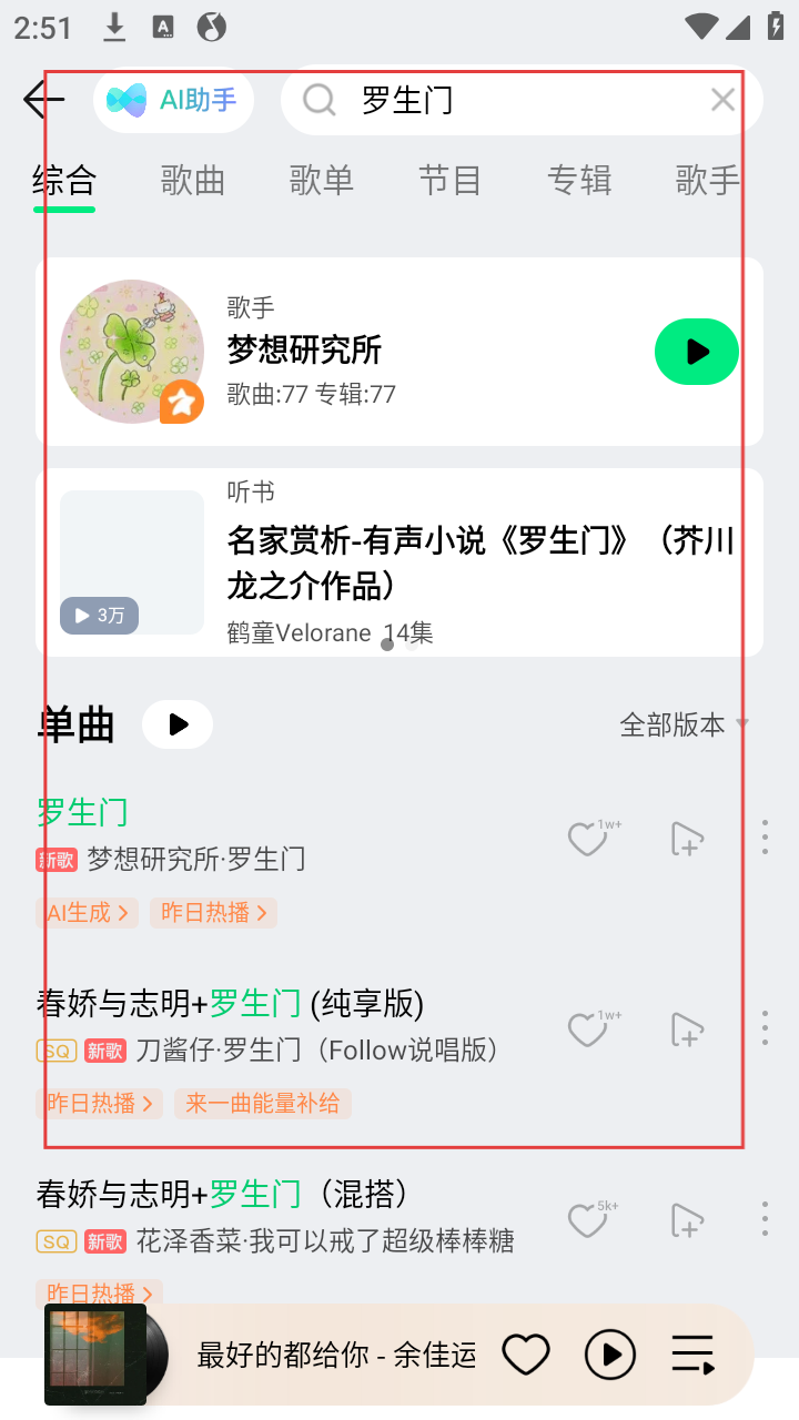 3、输入歌曲名后,会出现综合、歌曲等分类的搜索结果,找到目标歌曲所在区域。