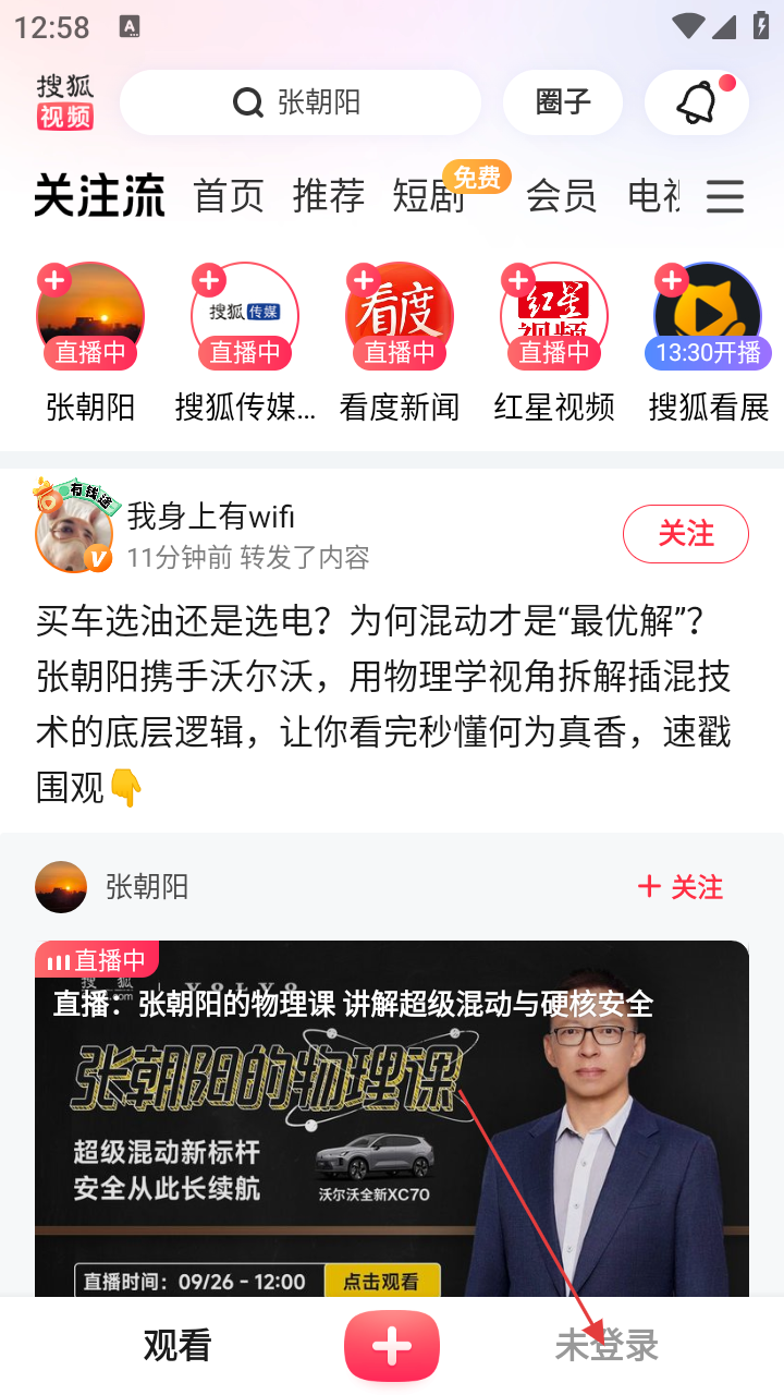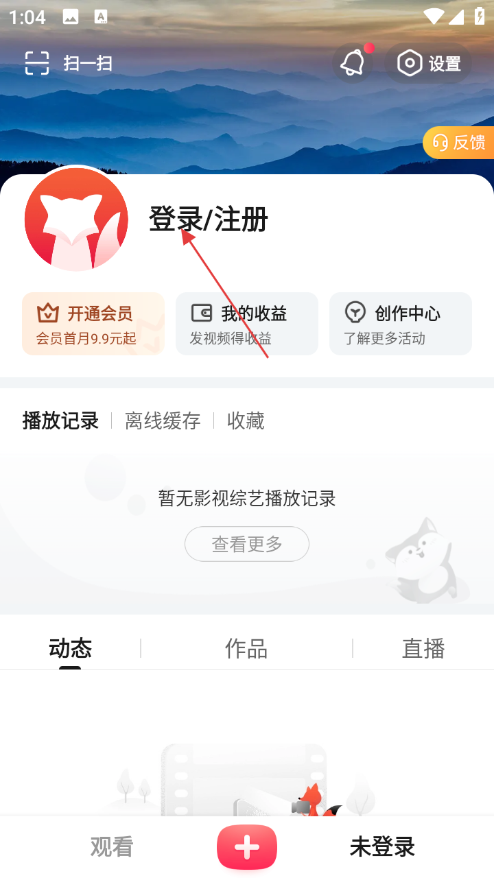 1、打开搜狐视频APP,进入首页后,点击右下角的【未登录】,进入个人页面。