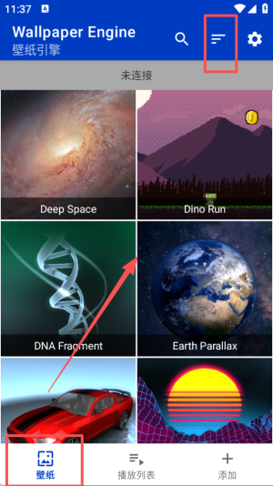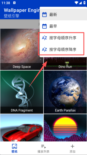 1、点击界面上方的排序图标,在弹出的选项里选择按字母顺序排序壁纸。