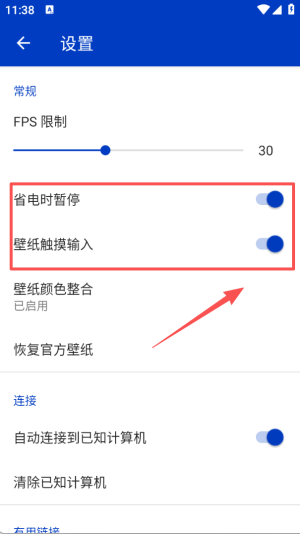 2、进入设置界面,找到 “省电时暂停” 与 “壁纸触摸输入” 选项,将这两个功能的开关开启。