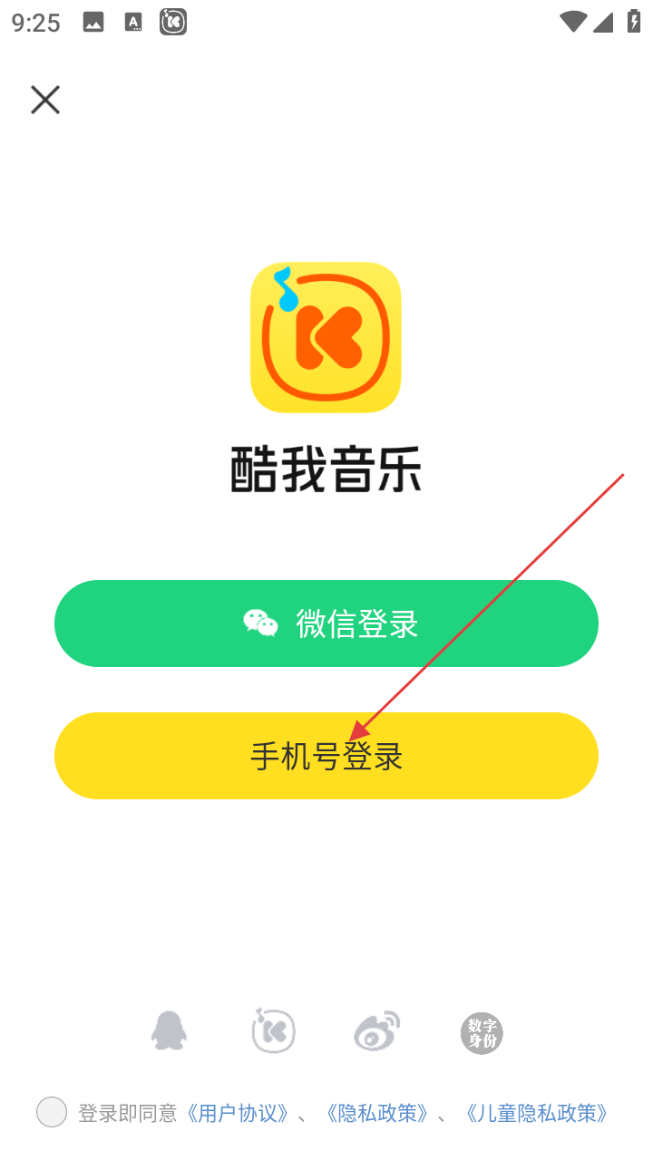 1、打开酷我音乐,会看到【协议与政策】页面,仔细阅读后,点击【同意】按钮,即可进入登录选择页面。