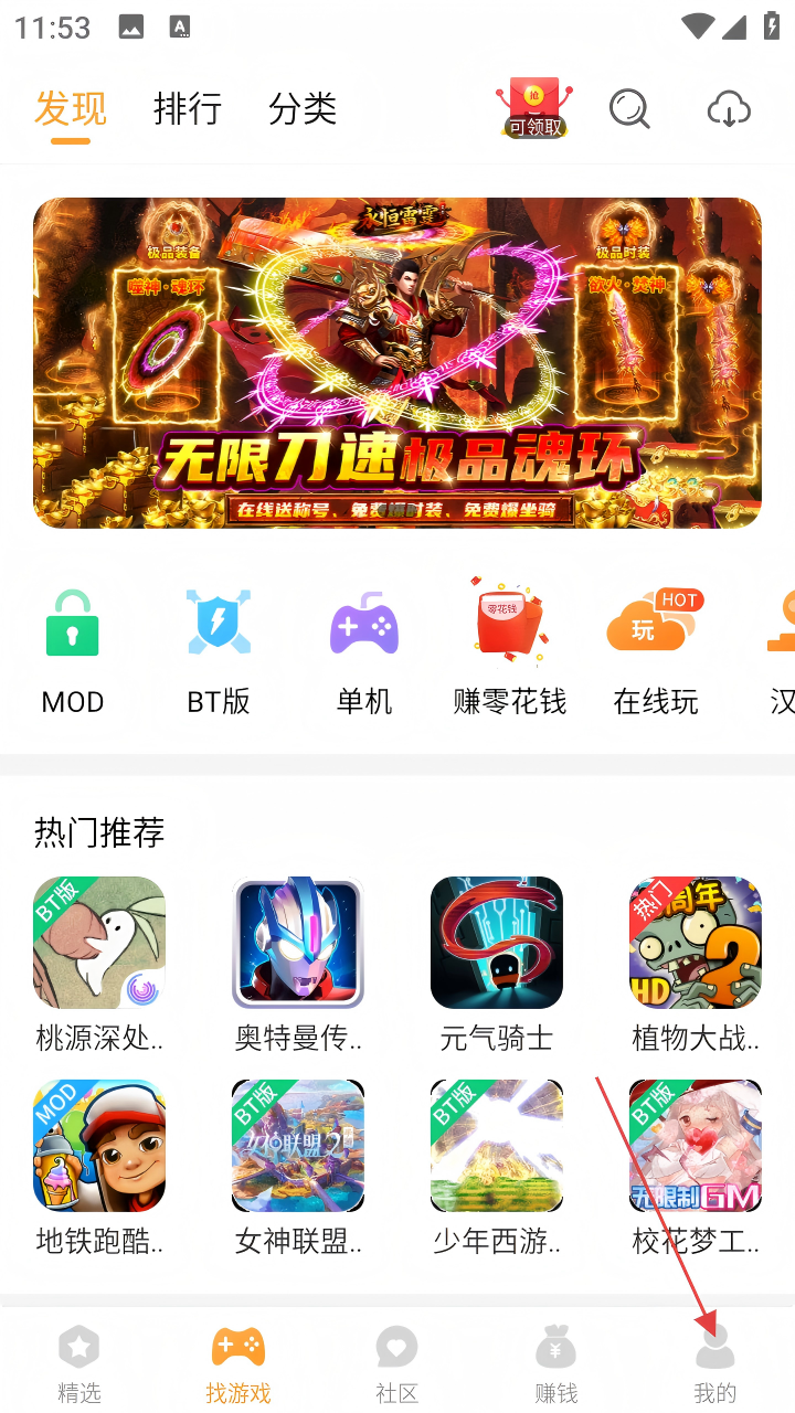 1、在软件“找游戏”页面,点击底部【我的】选项,可进入个人中心页面。