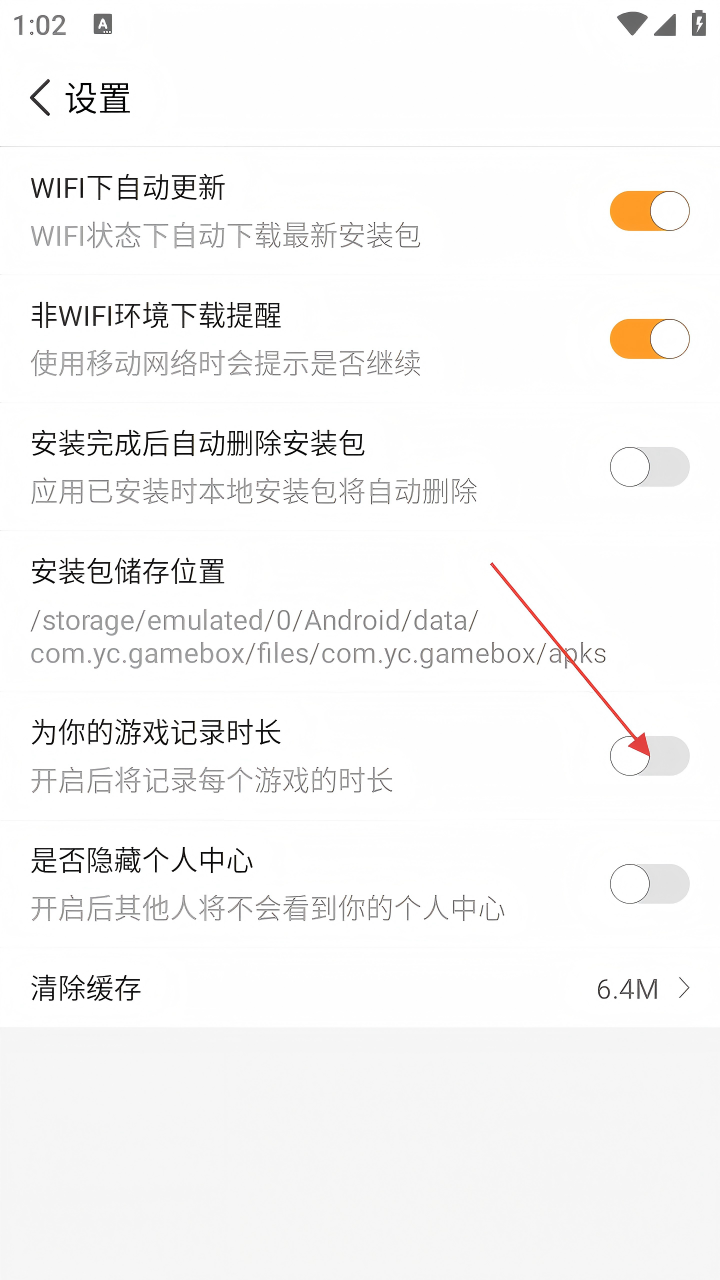 3、在设置页面,找到【为你的游戏记录时长】选项,点击其开关可开启该功能。