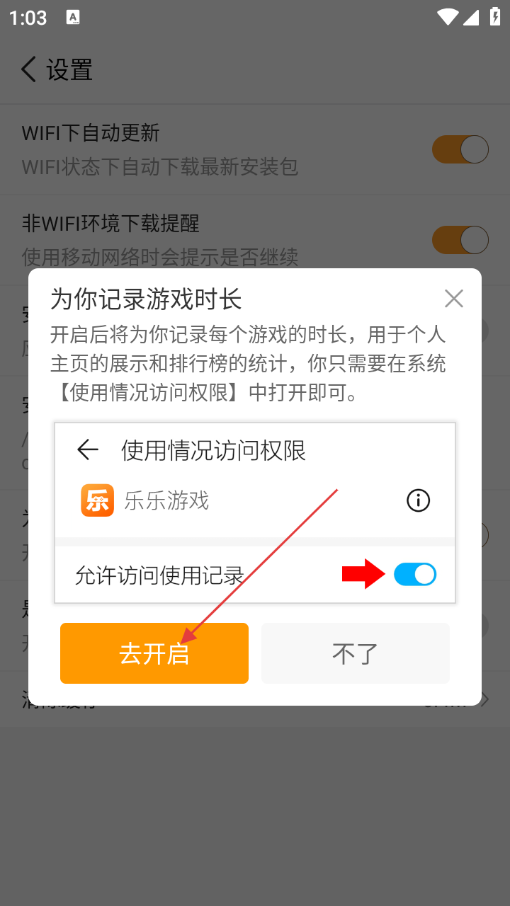 4、开启游戏时长记录功能时,会弹出权限提示框,点击【去开启】可前往设置系统使用情况访问权限。