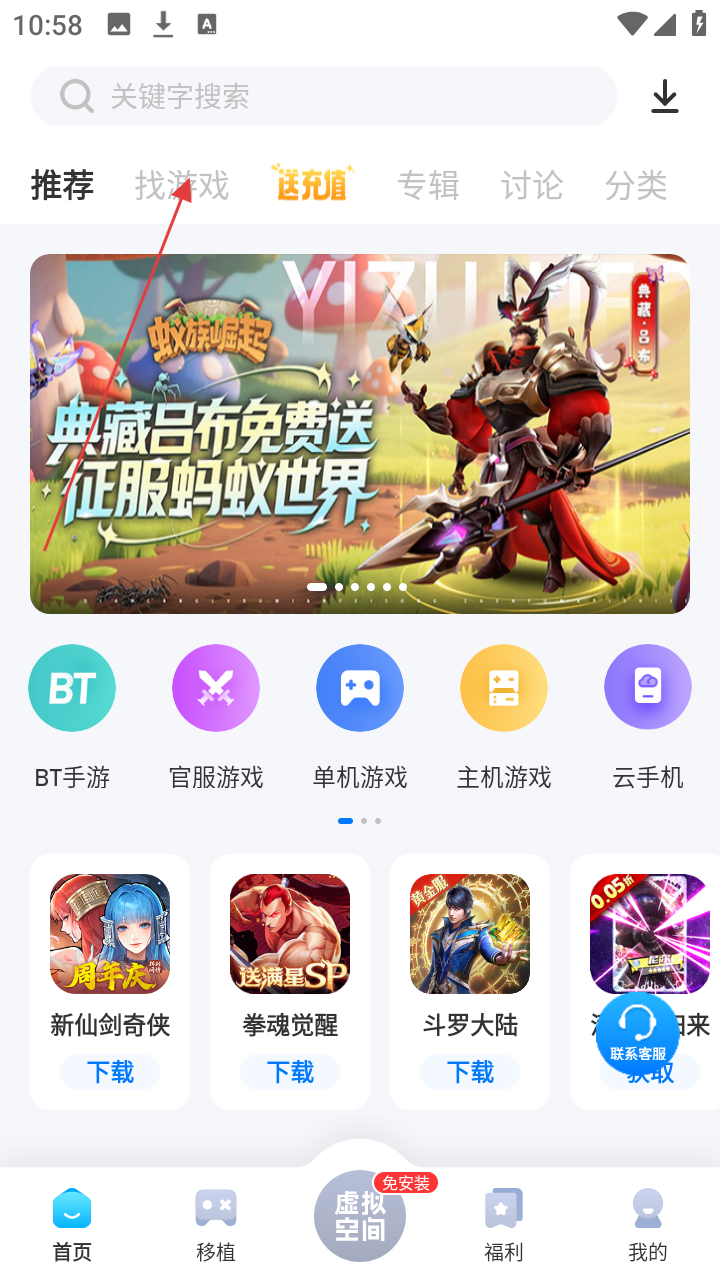1、在软件首页,点击顶部【找游戏】选项,可进入找游戏页面。