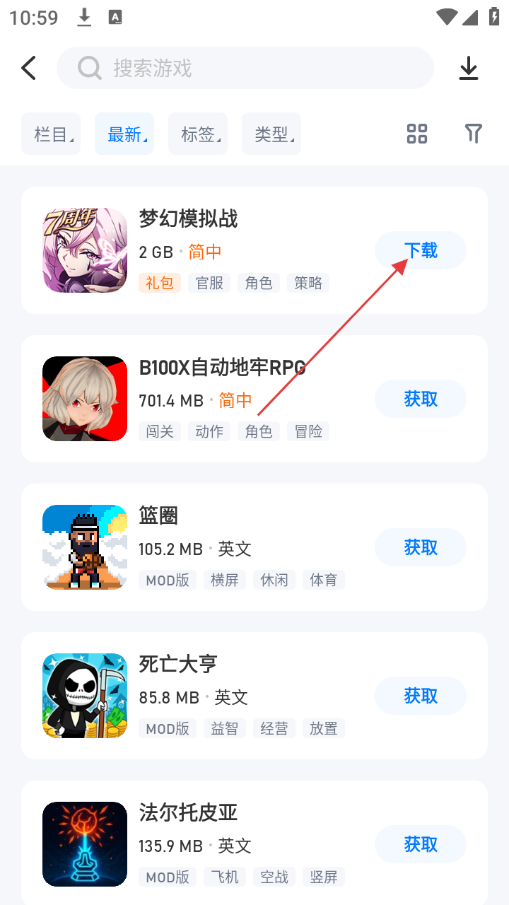 3、在游戏列表中,选择感兴趣的游戏,如《梦幻模拟战》,点击【下载】按钮。