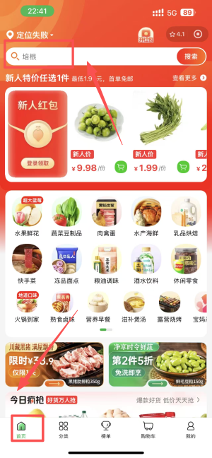 1、在首页搜索栏输入商品名称,例如“培根”,点击搜索。