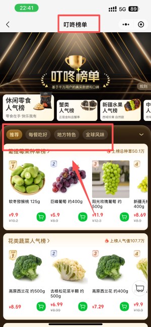 4、在叮咚榜单页面选择推荐商品,查看并购买热门商品。
