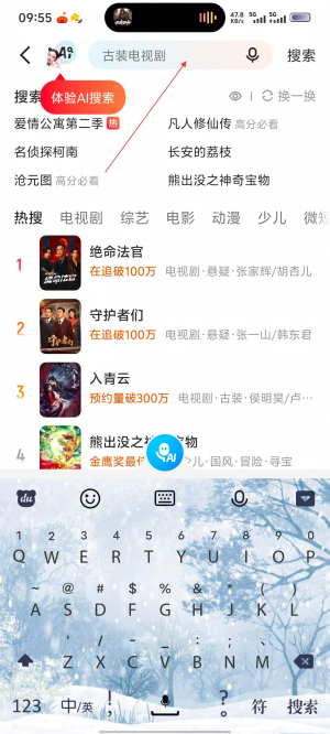 1、打开优酷,进入首页,能看到影视推荐,点击顶部【搜索框】,进入搜索页面。