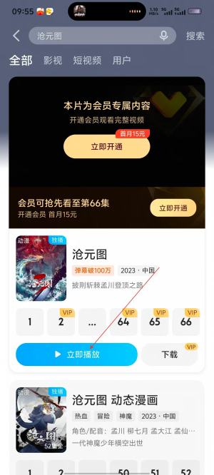 3、在搜索结果中,找到【沧元图】,点击其右侧【立即播放】按钮,进入播放页面。