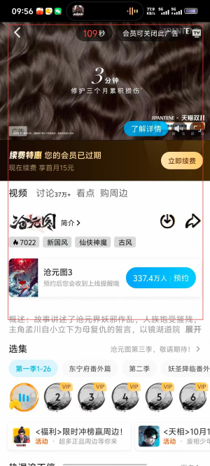 4、进入《沧元图》播放页面,非会员需观看广告,会员可关闭广告,享受流畅观看体验。