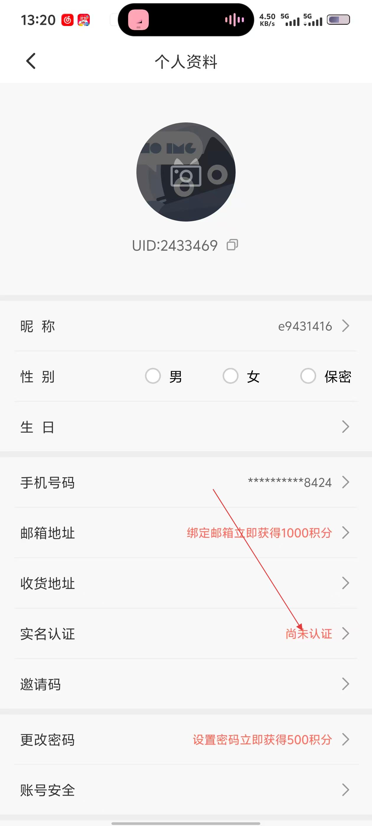 3、在个人资料页点击【实名认证-尚未认证】选项,进入实名认证页面,准备上传证件。
