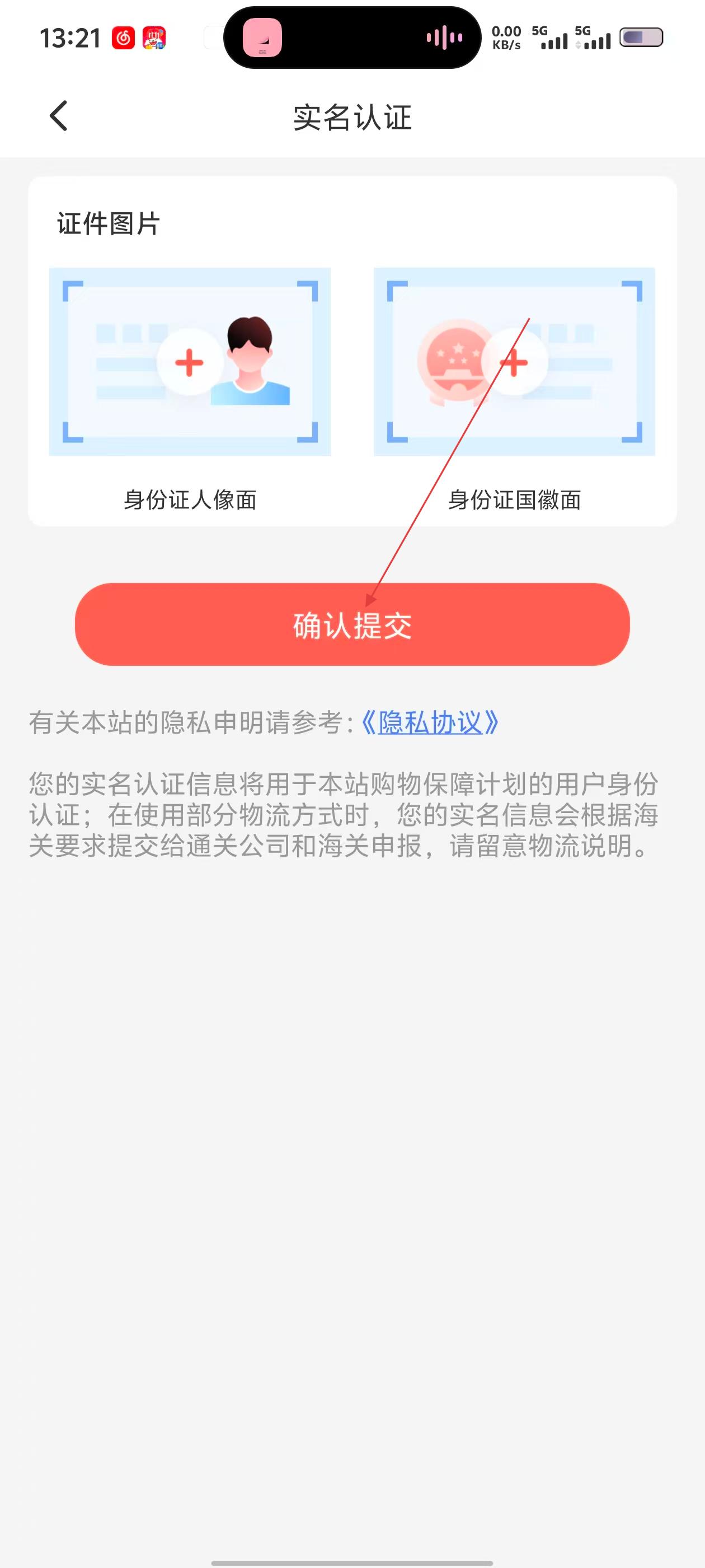 4、在实名认证页面上传身份证人像面和国徽面图片后,点击【确认提交】按钮完成认证操作。