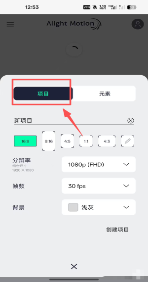 2、点“新项目”选 16:9 分辨率 1080p 30fps 浅灰背景再按“创建项目”完成初始化。