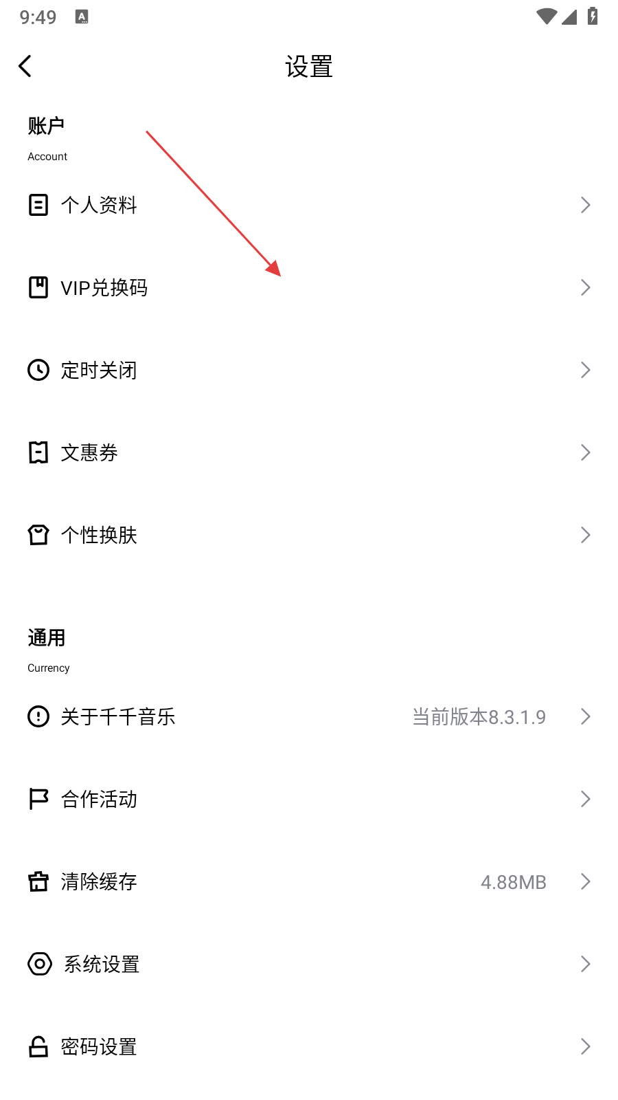 3、在设置页面点击【VIP兑换码】,进入VIP兑换码页面,可输入优惠码或兑换码。