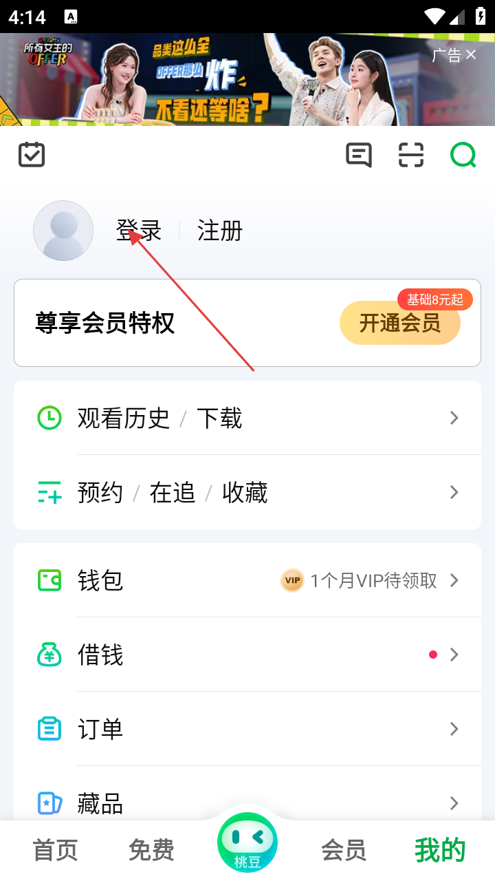 2、在个人页面,能看到观看历史、钱包等功能,点击【登录】进入登录界面。