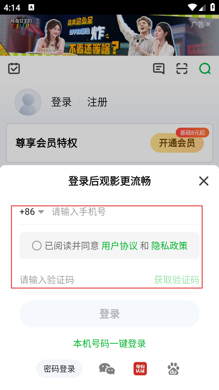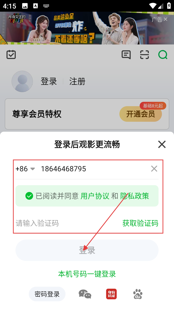 3、在登录界面,输入手机号,勾选【已阅读并同意-用户协议-和-隐私政策】,点击【获取验证码】。