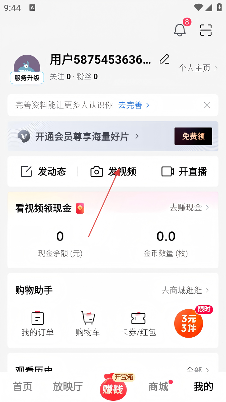 2、在个人页面中,点击【发视频】选项,进入视频发布相关页面。
