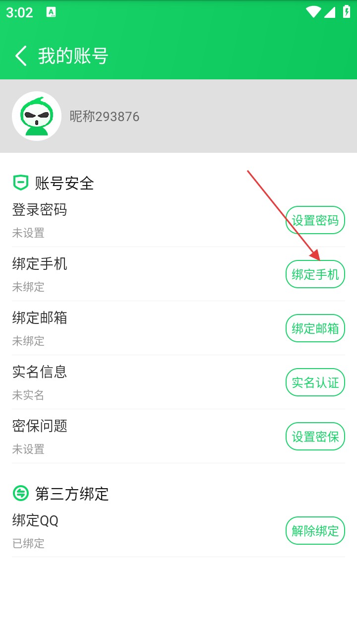 3、在账号安全设置页面,点击【绑定手机】选项,可进入绑定手机页面。