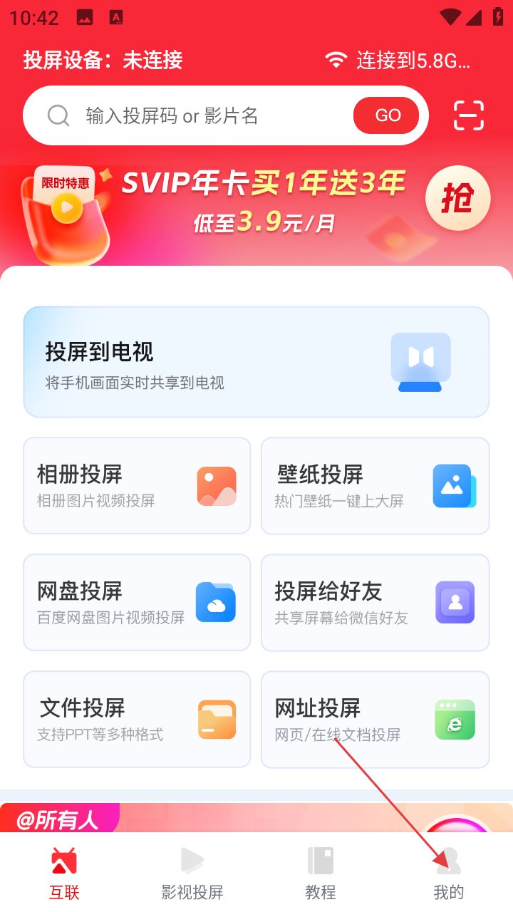 1、打开乐播投屏APP,进入主界面后,点击底部导航栏中的【我的】选项。