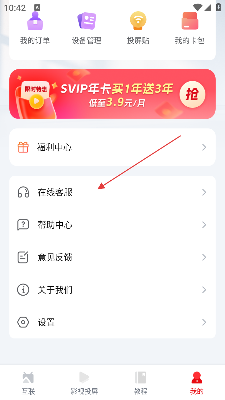 2、在“我的”页面,找到并点击【在线客服】选项。