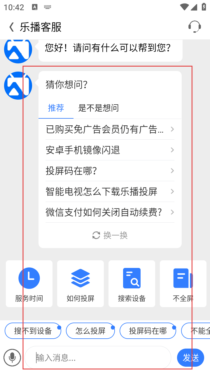 3、进入乐播客服界面后,可看到“猜你想问”板块,里面有已购买免广告会员仍有广告、安卓手机镜像闪退、投屏码在哪等常见问题。