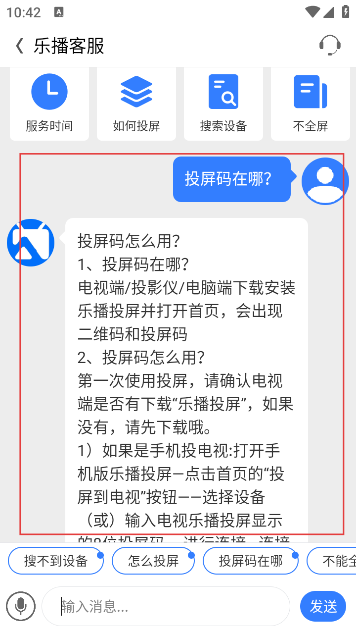 4、若有“投屏码在哪”的问题,可直接点击该问题,客服会给出详细解答。