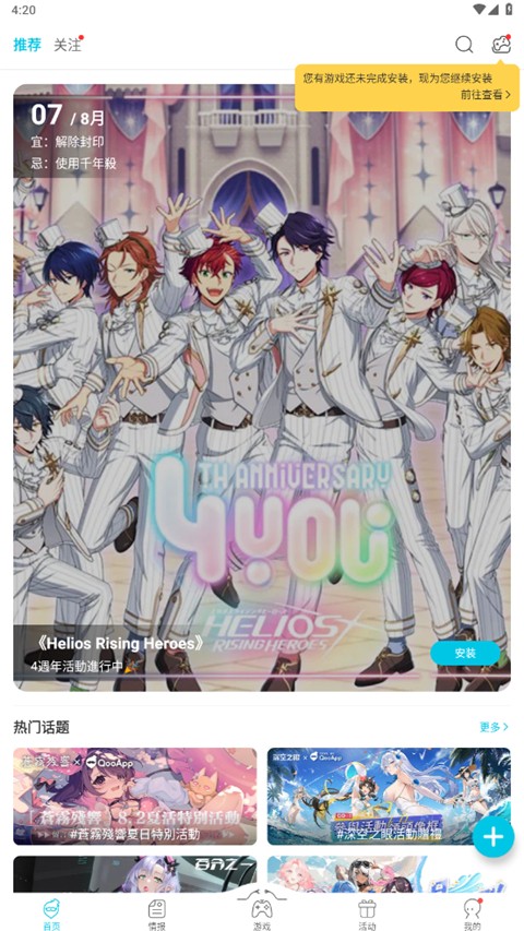 1、在【QooApp】首页,若需进入个人设置可点击右下角【我的】,首页展示有游戏推荐及热门话题。