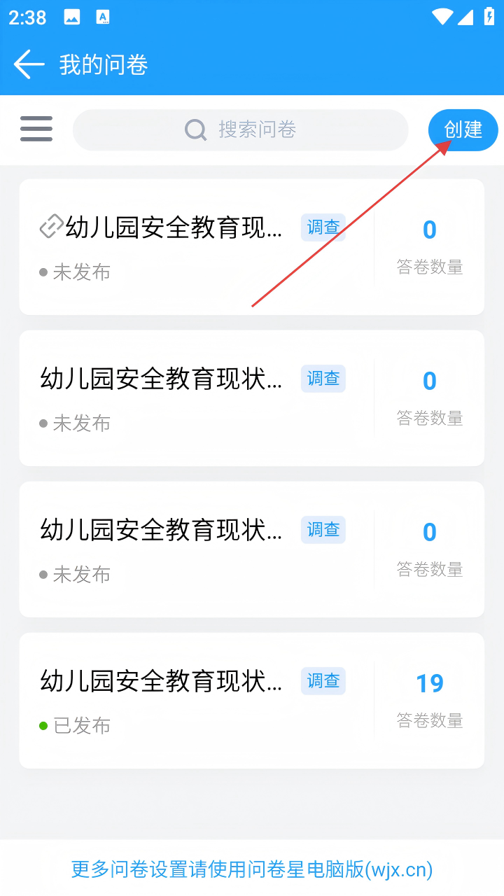 1、打开问卷星APP,进入“我的问卷”页面,点击右上角【创建】按钮。