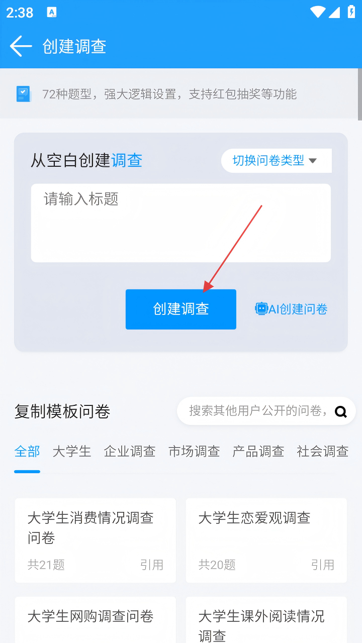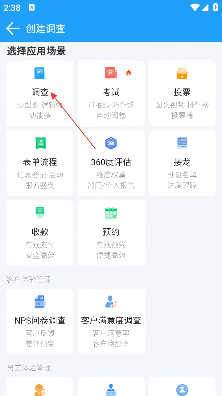 2、在“创建调查”页面,选择应用场景为【调查】。