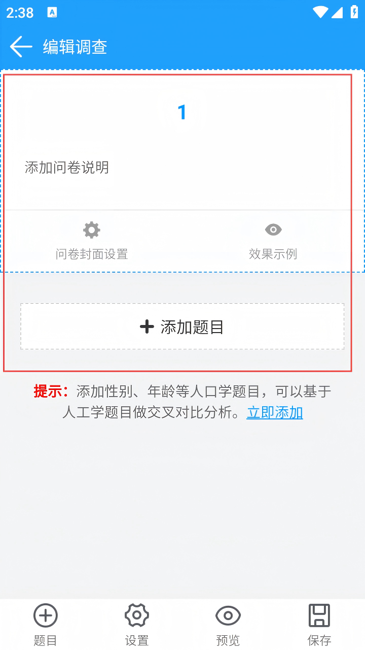 4、进入“编辑调查”页面后,可添加问卷说明、进行问卷封面设置,点击【+添加题目】添加题目,还能进行预览、保存等操作。