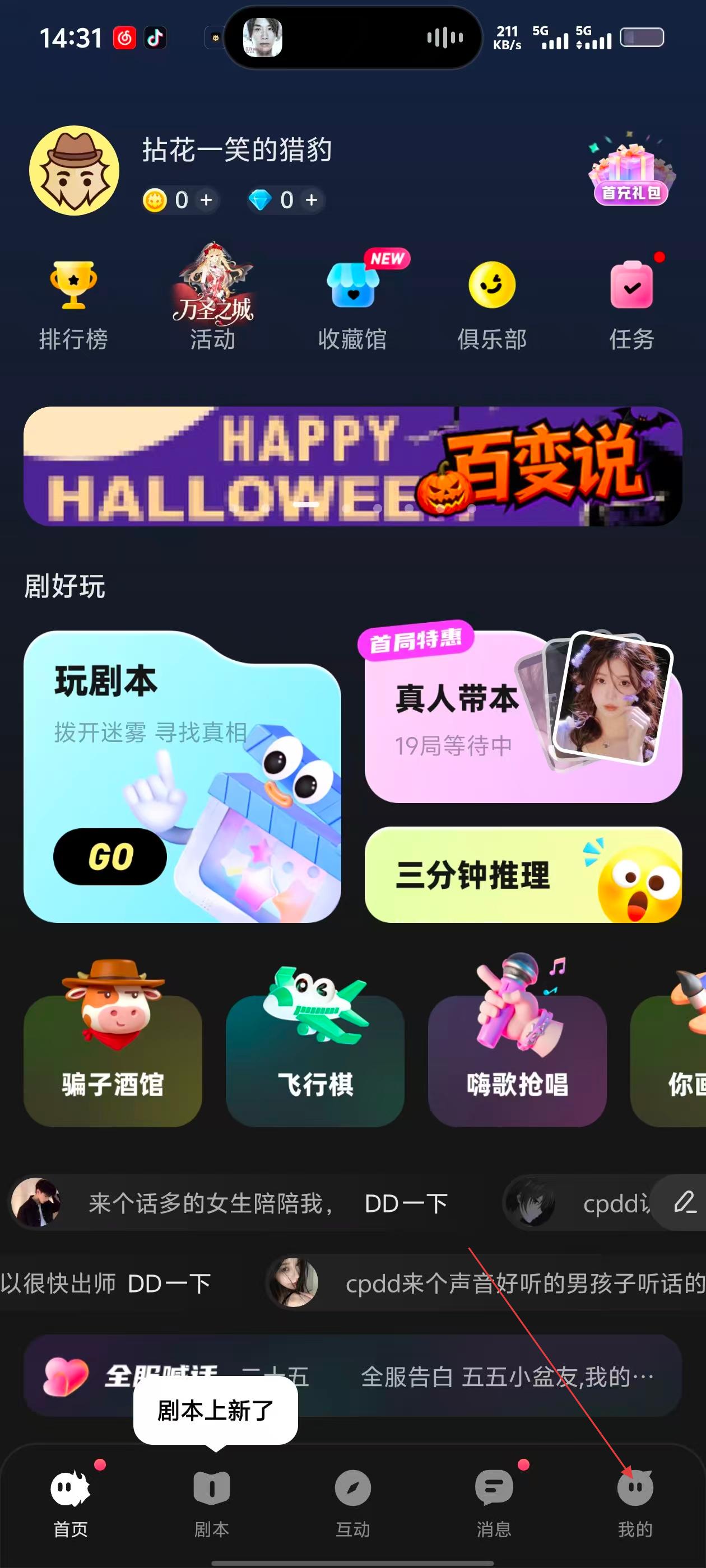 1、在百变大侦探首页,点击右下角【我的】,可进入个人相关界面,界面展示有排行榜、活动等功能入口。