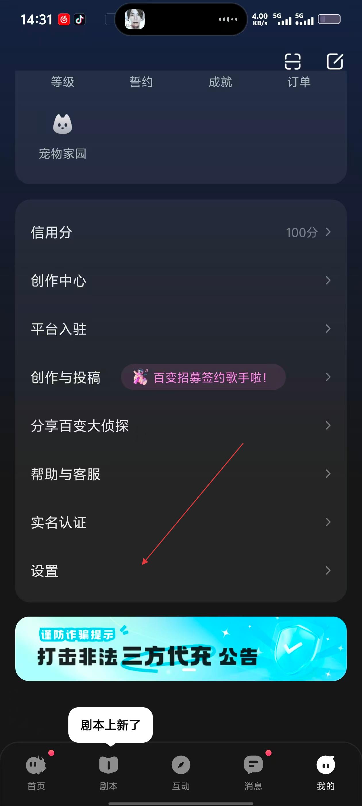 2、在【我的】界面,点击【设置】选项,可进入设置页面,界面显示信用分、创作中心等功能。
