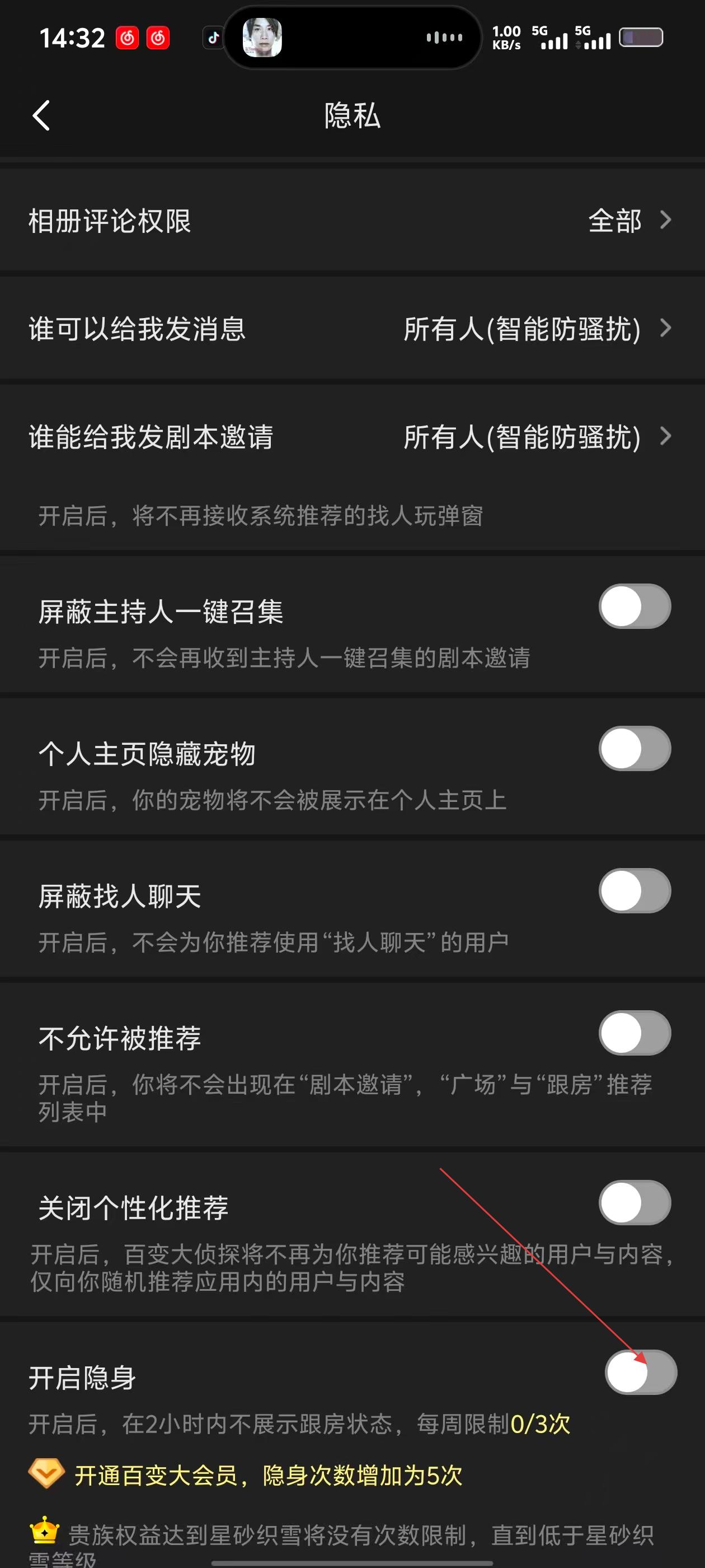 4、在隐私设置界面,开启隐身功能后,在2小时内不展示跟房状态,每周有次数限制,开通会员可增加次数。