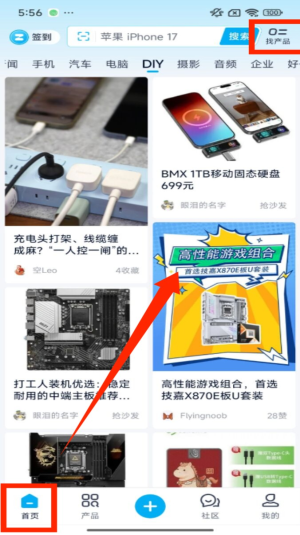 2、进入 APP 首页,点击右上角 “找产品” 按钮,可进入产品查找页面,首页还展示各类数码相关内容。