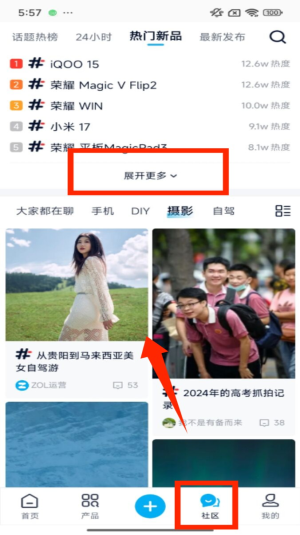 3、在社区页面,话题热榜下方有 “展开更多” 按钮,点击后可查看更多热门数码话题,获取更多内容。