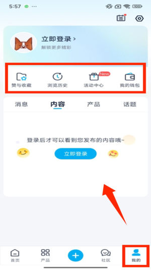 4、进入 “我的” 页面,可看到赞与收藏、浏览历史等功能入口,切换到 “内容” 标签,登录后能查看发布的内容。