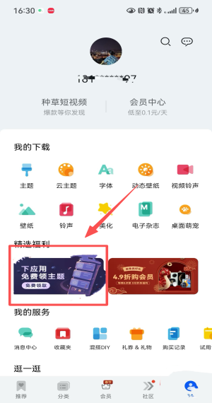 3、回首页进“会员中心”,点“免费领主题”抢0.1元/天福利。