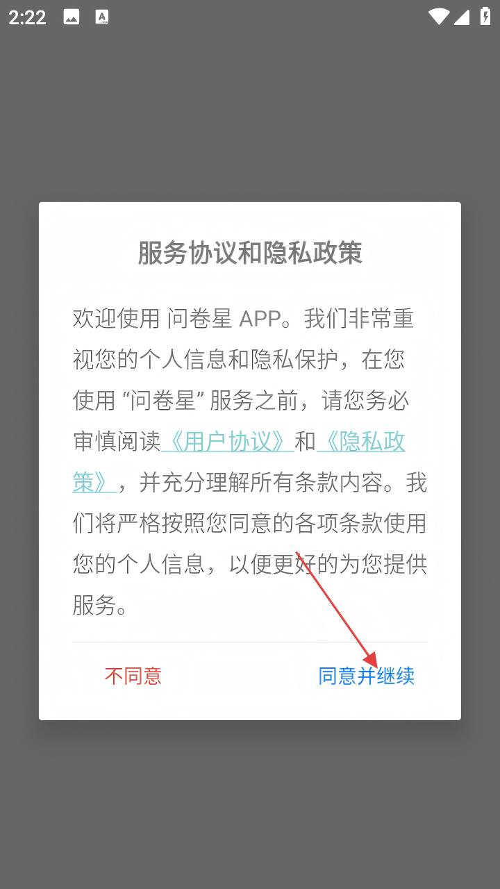 1、打开问卷星APP,在弹出的“服务协议和隐私政策”提示框中,点击【同意并继续】。