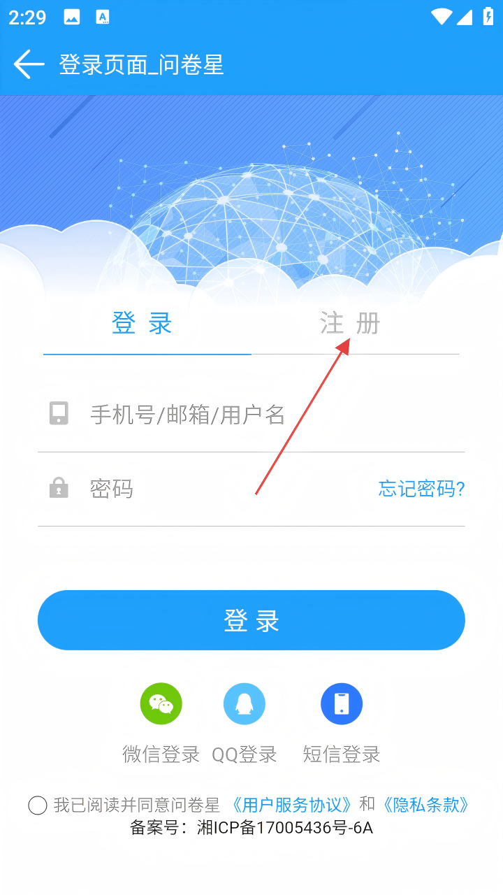 2、进入登录页面后,点击【注册】选项,进入注册页面。