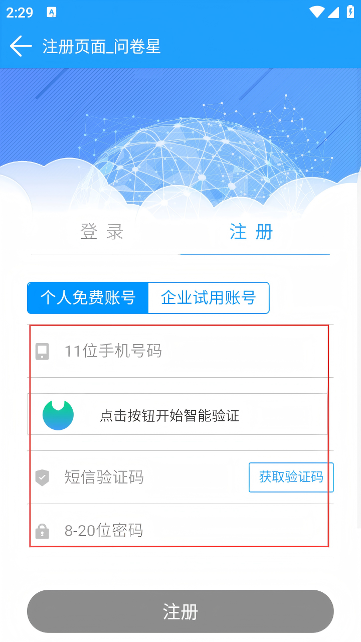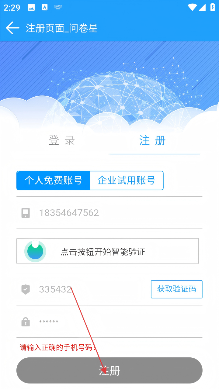 3、在注册页面,选择“个人免费账号”,输入手机号码,点击按钮开始智能验证,然后点击【获取验证码】。