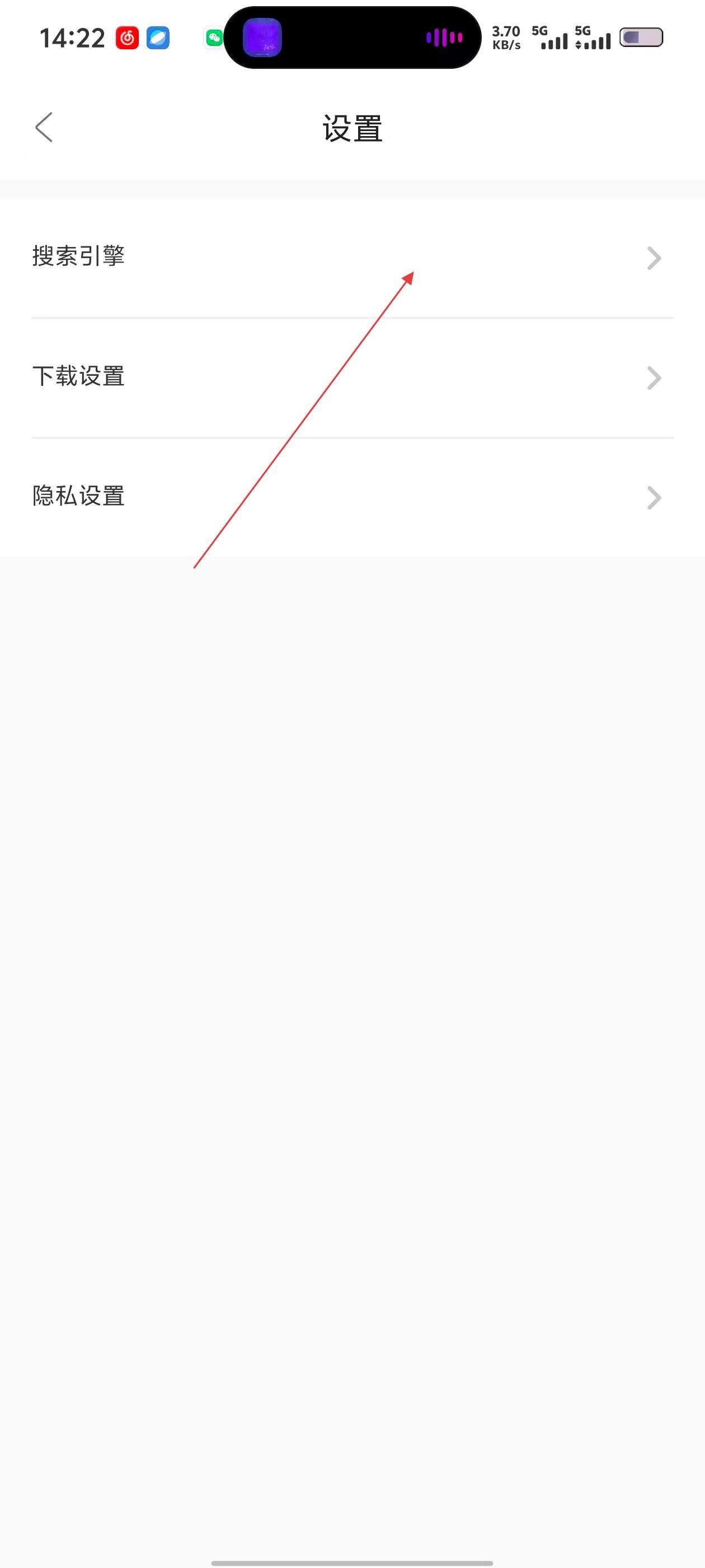 2、在【我的】页面点击【设置】选项,进入设置界面,找到搜索引擎相关入口。